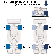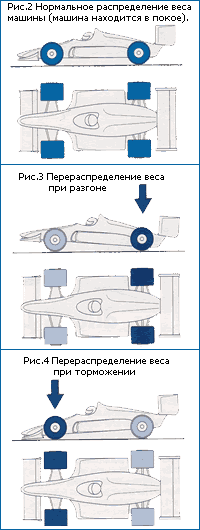 Итак, во время разгона перераспределение веса вызывает загрузку задних шин, и, следовательно, их сцепление с трассой возрастает. Во время торможения, наоборот, загружаются передние шины, и их сцепление увеличивается. В повороте загружаются внешние шины, и их сцепление возрастает.