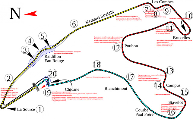 Чтобы помочь вам с вашими наблюдениями, мы добавили в руководство карту трассы в Спа с соответствующими пометками по настройке на различных участках и поворотах.
