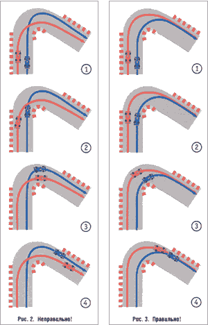 Для того, чтобы попасть на внутреннюю траекторию, главное — поравняться с машиной соперника, «показать» себя, и совсем не обязательно его опережать. Напротив, слишком глубокий вход опасен тем, что вашу машину может развернуть. В результате слишком глубокого входа выход будет медленным и очень широким. Это даст сопернику возможность «перекрестить» траекторию на выходе и все равно оказаться впереди (рис. 2).