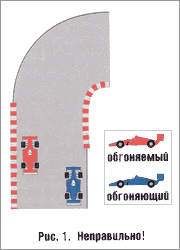 Рассмотрим конкретные примеры. Начнем с того, как не надо делать (рис. 1). В этой ситуации гонщик, находящийся снаружи, «захлопнет калитку» буквально перед носом у того, кто пытается обогнать «по внутри». Причина в том, что атакующий не «показал» себя. Он не смог поравняться с другой машиной, остался в «слепой зоне», и соперник, возможно, его просто не видит. Плохо и то, что его машина идет слишком сильно внутри, то есть очень далеко от машины соперника. В случае их столкновения это увеличит силу удара (если расстояние между машинами измеряется сантиметрами, то при столкновении повреждения будут минимальными и, вероятнее всего, оба продолжат гонку).