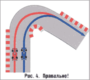 Все, что от вас требуется, это поравняться с соперником на входе в поворот, и он — ваш (рис. 3 ). Но если при этом точка входа в поворот у вас останется прежней, то это будет слишком ранний вход для такой ситуации. Точка входа должна быть смещена ближе к центру поворота, а как только вы попадаете на идеальную траекторию, главное — удержаться на ней и сразу начать ускорение (рис. 4). В любом случае, вы начнете его раньше соперника!