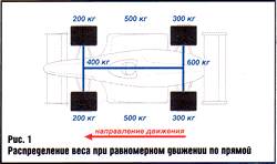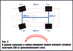 Предположим, что наш воображаемый гоночный автомобиль, выезжающий на трассу, весит 1000 кг. При этом 400 кг приходятся на переднюю ось и 600 кг — на заднюю. Этот вес распределяется равномерно между его правой и левой половинами (см. рис. 1). Представим, что под влиянием силы в1g, действующей на автомобиль в повороте, 200 кг веса перераспределятся от внутренних колес к внешним (рис. 2), которые получат 700 кг вертикальной нагрузки. Главный вопрос — какое колесо (переднее или заднее) получит большую часть дополнительной нагрузки. Ее величину можно варьировать регулировкой жесткости пружин или стабилизаторов поперечной устойчивости.