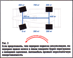 Чтобы показать, как жесткость пружин влияет на баланс веса автомобиля в повороте, рассмотрим экстремальные ситуации. Предположим, что передняя подвеска отсутствует, и колеса прикручены прямо к кузову (рис. 3). В этом случае вся дополнительная нагрузка сразу придет на внешнее переднее колесо. Из-за слишком быстрого перераспределения веса передняя ось заскользит — автомобиль проявит недостаточную поворачиваемость. Теперь вернем амортизаторы и переднюю подвеску на место и устраним заднюю. В этом случае весь дополнительный вес мгновенно загрузит внешнее заднее колесо, что тут же вызовет избыточную поворачиваемость. Делаем вывод: снижая жесткость передних пружин, мы меняем баланс поворачиваемости от недостаточной к нейтральной. Более жесткие пружины задней подвески увеличивают тенденцию к избыточной поворачиваемости, а более мягкие — работают в противоположном направлении. Казалось бы, чем мягче пружины (и стабилизаторы), тем медленнее перераспределяется вес и, следовательно, выше сцепление в повороте. Но, стремясь сделать автомобиль как можно мягче, многие приходят в конце концов к прямо противоположному результату — сцепление падает. Конструкции подвесок на разных автомобилях различные, и главное ограничение подобных регулировок — это максимально допустимые значения крена кузова. При их превышении геометрия подвесок меняется, и пятно контакта шины может уменьшиться, а значит, уменьшится и сцепление. Таким образом, на деле все оказывается значительно сложнее, чем в теории. На трассах с неровным покрытием всегда лучше выбрать более мягкую регулировку. Объясняется это тем, что перераспределение веса не будет слишком резким (на сжатие более мягкой подвески по требуется больше времени), а значит, баланс автомобиля будет меняться более плавно. При же сткой подвеске машина будет хуже управляться, так как перераспределение веса будет происхо дить рывками.